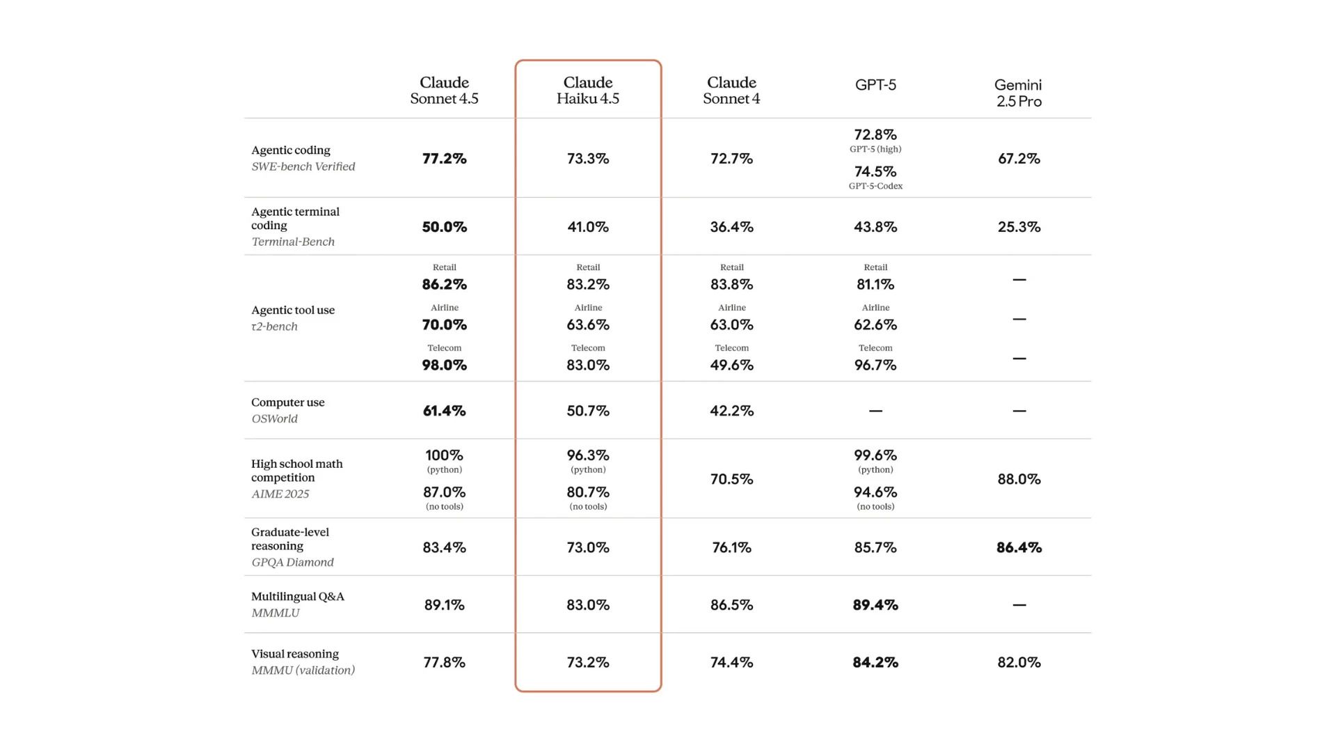 Попри компактні розміри, Haiku 4.5 майже не поступається Sonnet 4.5 у міркуванні, плануванні та написанні коду. Вона продемонструвала 73,3% точності на бенчмарку SWE-bench Verified, який оцінює здатність моделі виконувати завдання програмної розробки. Для порівняння, Sonnet 4.5 набрала 77,2%.
