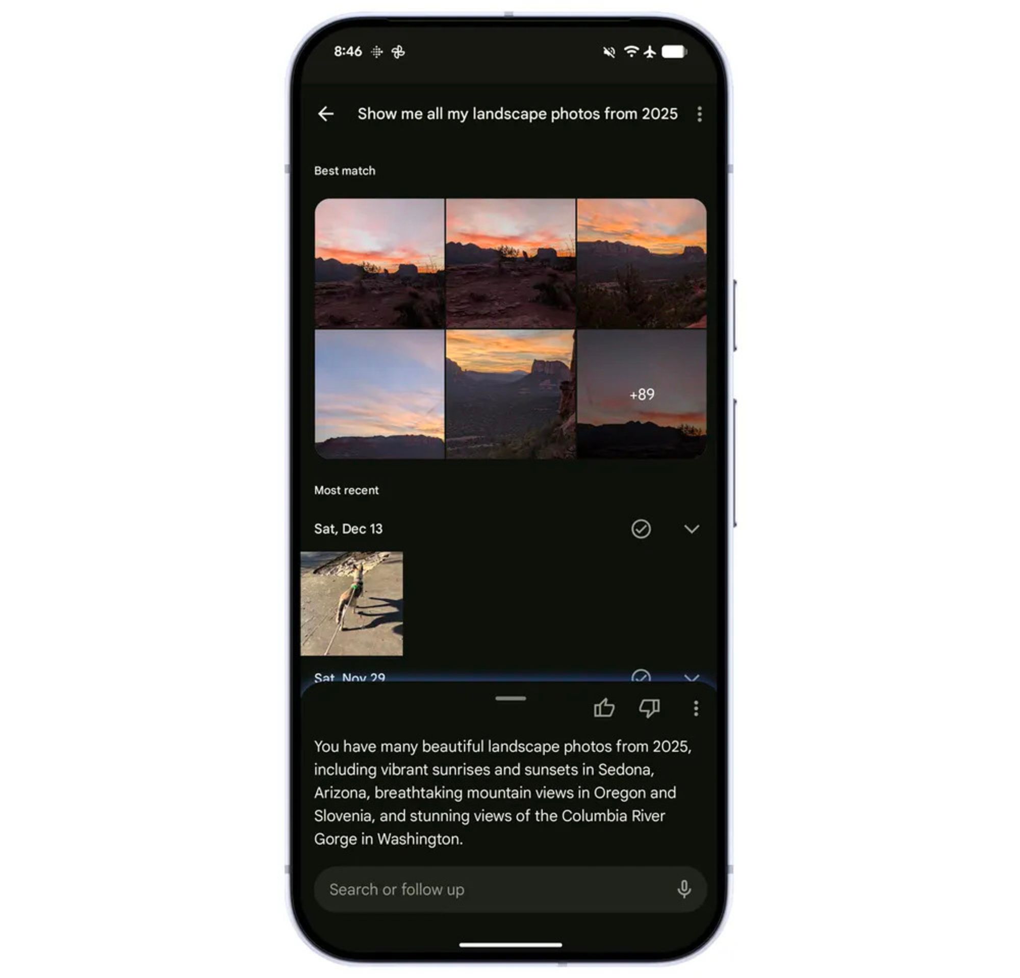 Функція Ask Photos дозволяє знаходити конкретні фото й відео у всій бібліотеці «Google Photos» за допомогою текстових запитів. Вона допомагає швидко відновити спогади за 2025 рік — наприклад, показати пейзажі, поїздки, відвідані місця або навіть страви. Користувачі можуть ставити запитання на кшталт «коли я був у Хорватії?» чи «де я подорожував цього року», щоб переглянути відповідні знімки та відео.