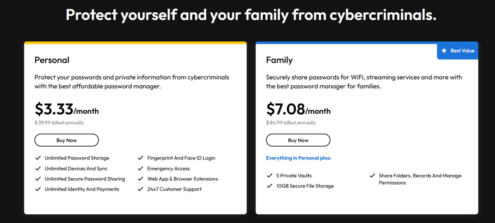 Безкоштовний план дає можливість зберігати необмежену кількість паролів, але працює лише на одному активному пристрої. Платні тарифи відкривають синхронізацію між кількома пристроями та розширені функції безпеки. Є також сімейний план на шість користувачів.