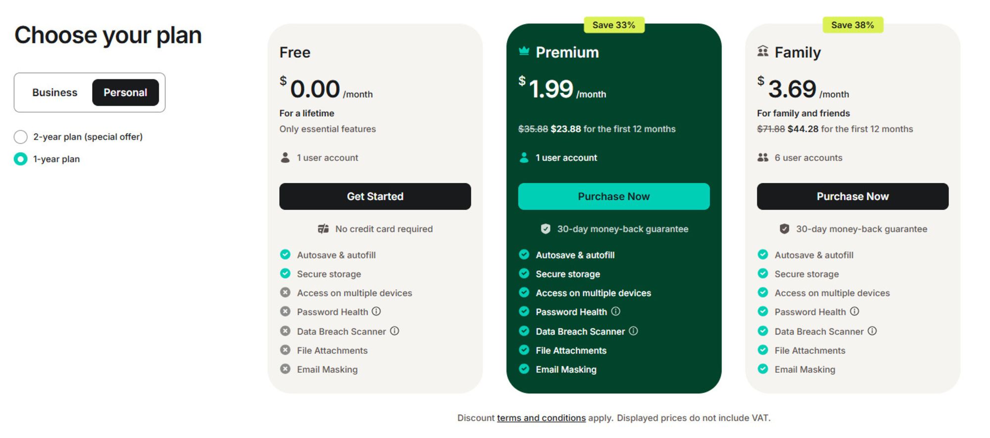 Ціна — одна з найнижчих (Premium від ~$1,49–$1,99 на місяць із промо, Family ~$2,79–$3,69 на місяць за 6 осіб, із частими знижками).