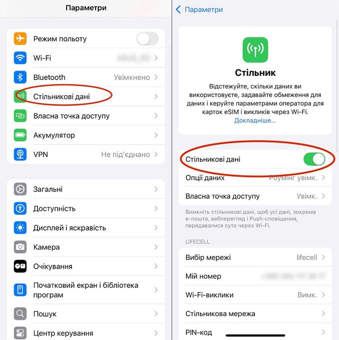 Спершу відкрийте «Налаштування» → «Стільникові дані» (або «Мобільні дані», залежно від мови системи) й переконайтеся, що мобільний інтернет увімкнений.
