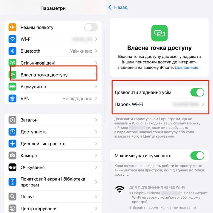 1. На iPhone відкрийте «Налаштування» → «Режим модема» у активуйте функцію «Дозволити з’єднання усім».