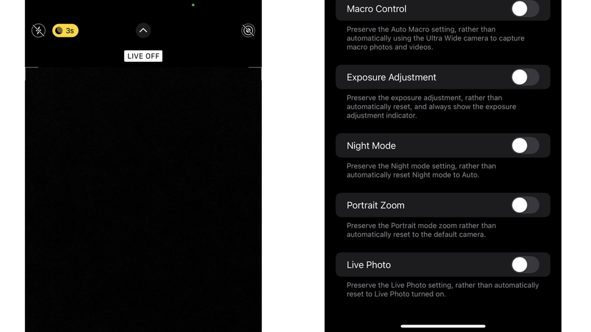Щоб це вимкнути, спершу відкрийте Камеру та натисніть на іконку Live Photo у верхньому правому куті, щоб вимкнути режим. Потім перейдіть у Налаштування > Камера > Зберігати налаштування та увімкніть перемикач біля Live Photo. Це гарантує, що функція не вмикатиметься знову автоматично.