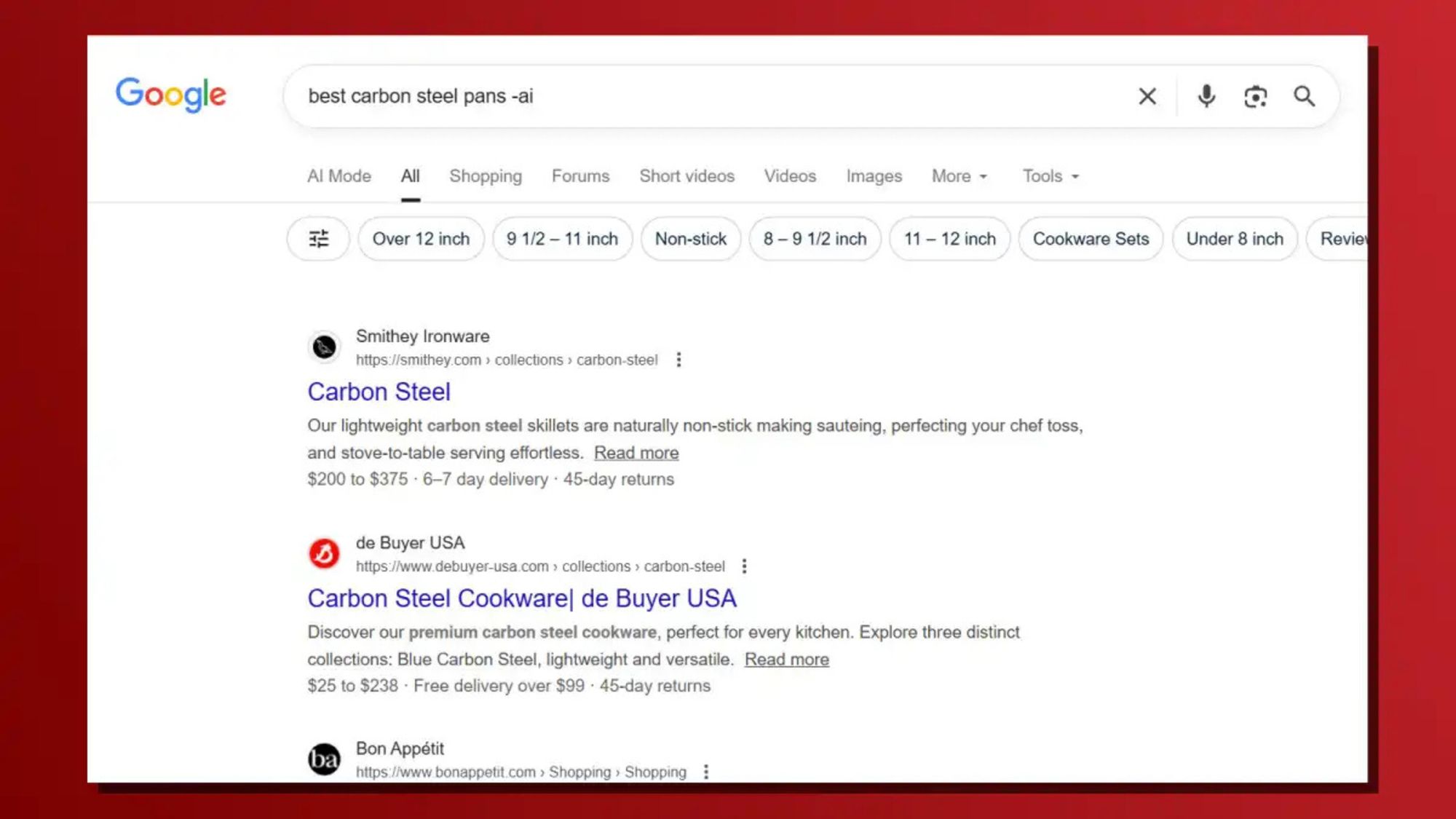 Щоб уникнути AI-підсумків у Google, додайте параметр -ai в кінець пошукового запиту. Наприклад, якщо ви вводите запит best carbon steel pans і не хочете бачити AI-узагальнення, шукайте best carbon steel pans -ai.