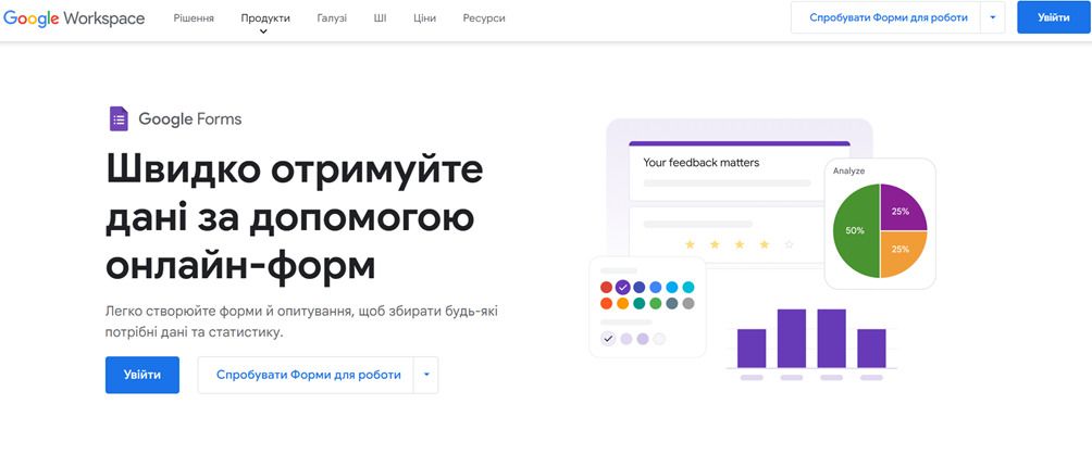 Google Forms — простий інструмент для створення онлайн-опитувань, тестів і хєформ зворотного зв’язку. Платформа є частиною екосистеми Google Workspace, тому чудово підходить тим, хто вже працює з Gmail, Drive чи Таблицями. Дані з опитувань миттєво зберігаються у Google Sheets, що дає можливість одразу аналізувати відповіді або експортувати їх у зручному форматі.