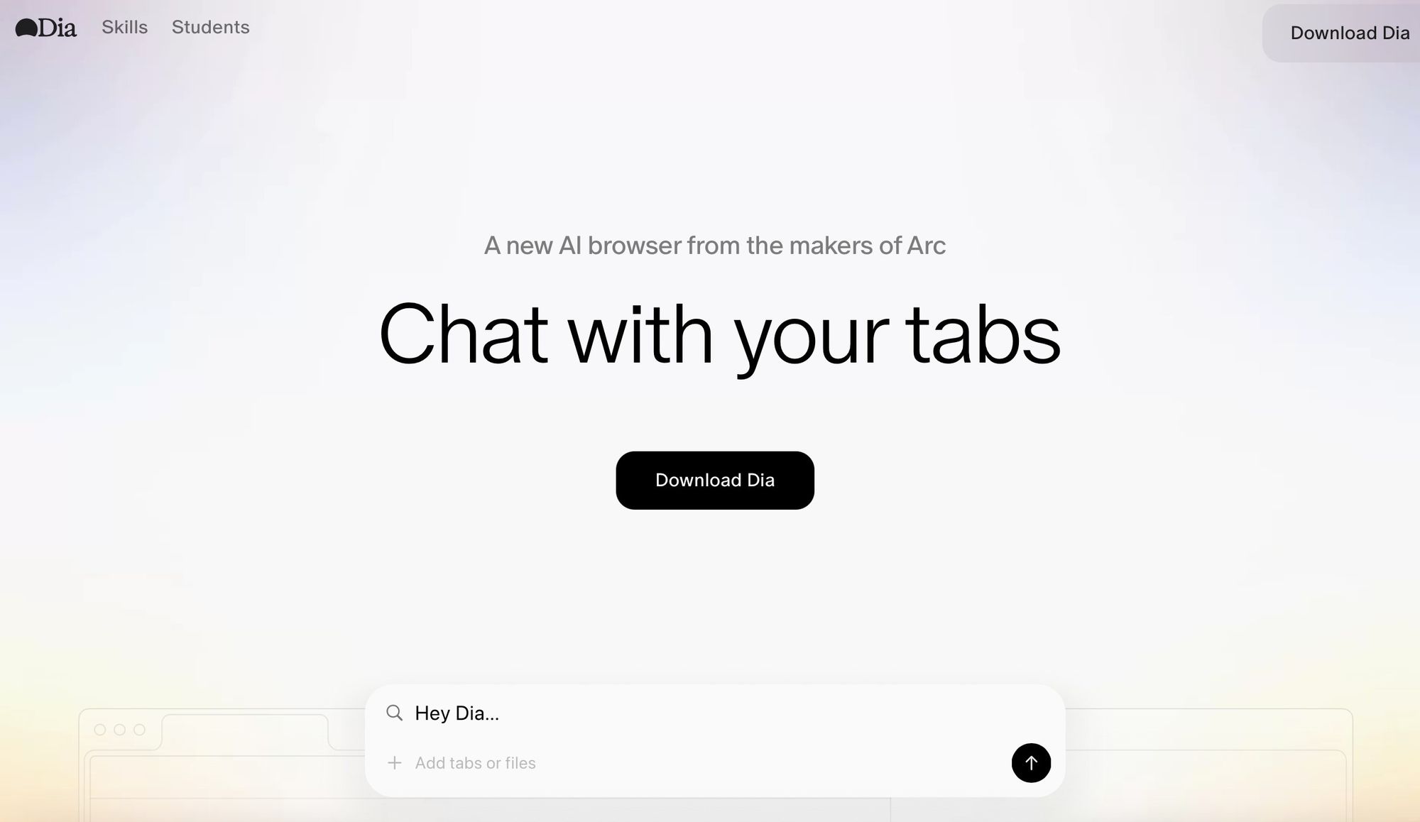 Dia — ШІ-браузер від The Browser Company, команди, яка також створила Arc. Його основна ідея — чат із вкладками. Ви переглядаєте сторінки як у звичному браузері, але паралельно можете ставити запитання і давати команди, прив’язані до поточної сторінки, інших вкладок, виділеного фрагмента або історії перегляду.