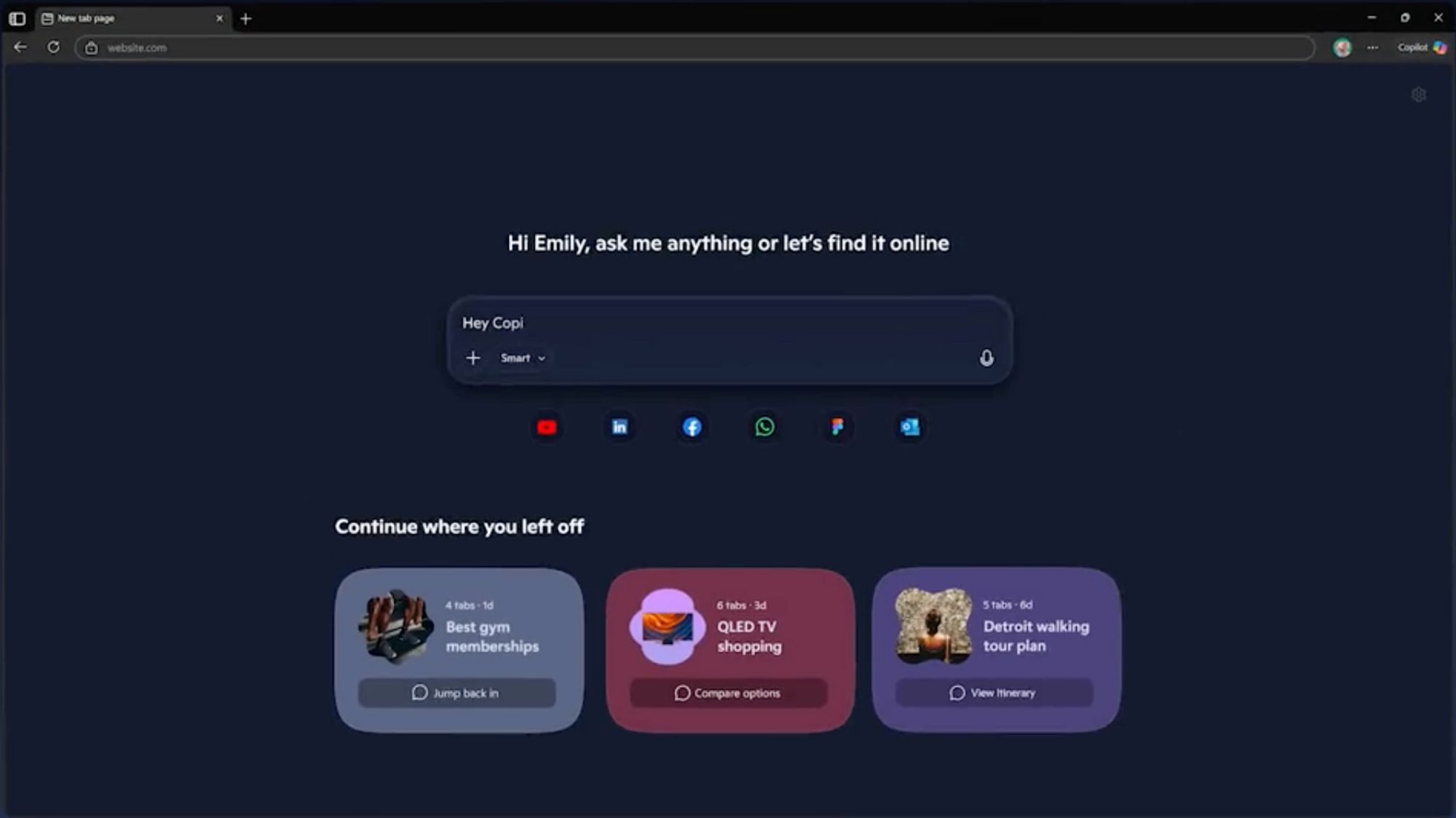 - Copilot у бічній панелі. Працює паралельно з переглядом сторінки: можна попросити згенерувати або перефразувати текст, швидко підсумувати матеріал і допомогти з пошуком без перемикання між вкладками.