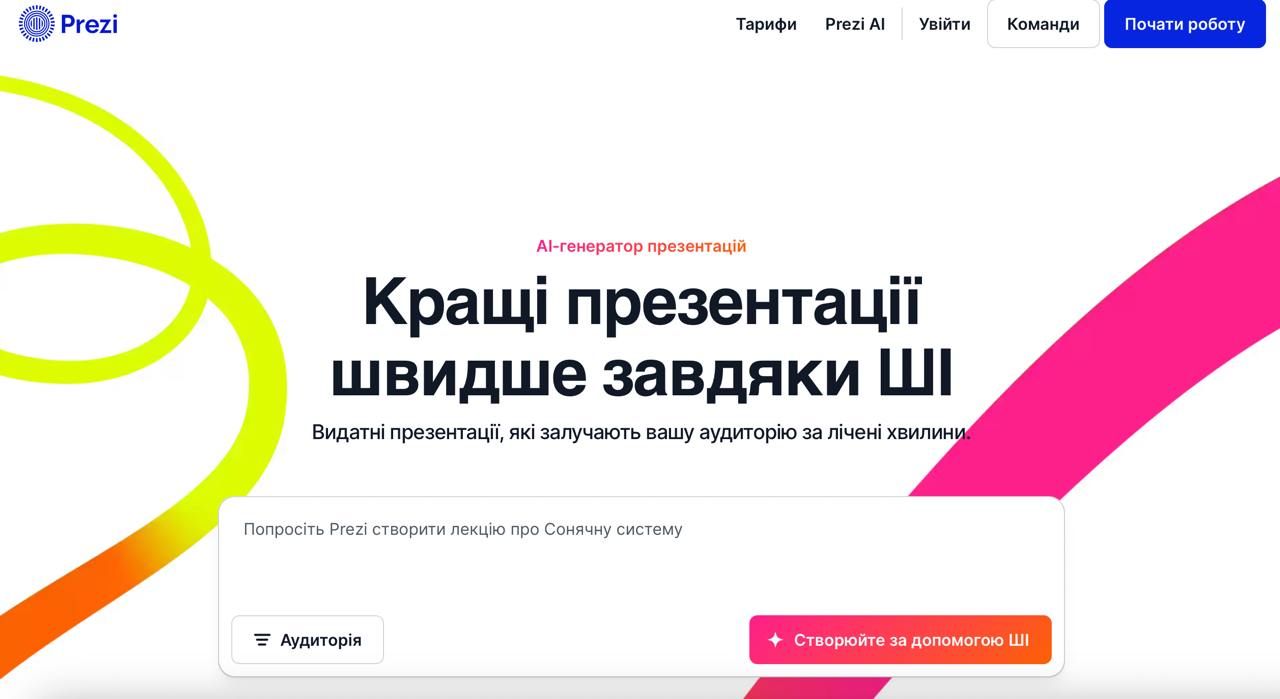 - AI-інструменти. Сервіс пропонує функції на базі штучного інтелекту, які допомагають швидше підготувати структуру презентації та окремі елементи оформлення.