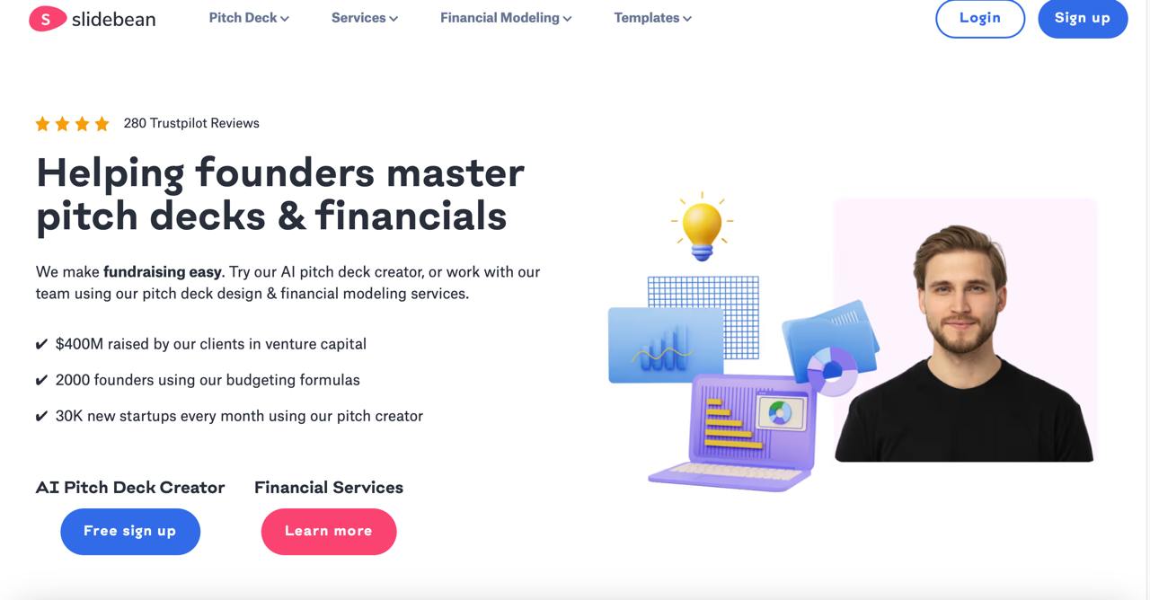 Slidebean — сервіс для створення презентацій із фокусом на бізнес-сегмент. Його часто використовують для підготовки пітчдеків, презентацій для інвесторів і продажних матеріалів. Платформа пропонує готові шаблони, AI-інструменти та автоматизоване оформлення слайдів, а також окремі послуги з розробки презентацій. Сервіс буде корисним користувачам, яким потрібно швидко зібрати презентацію й не витрачати багато часу на оформлення.