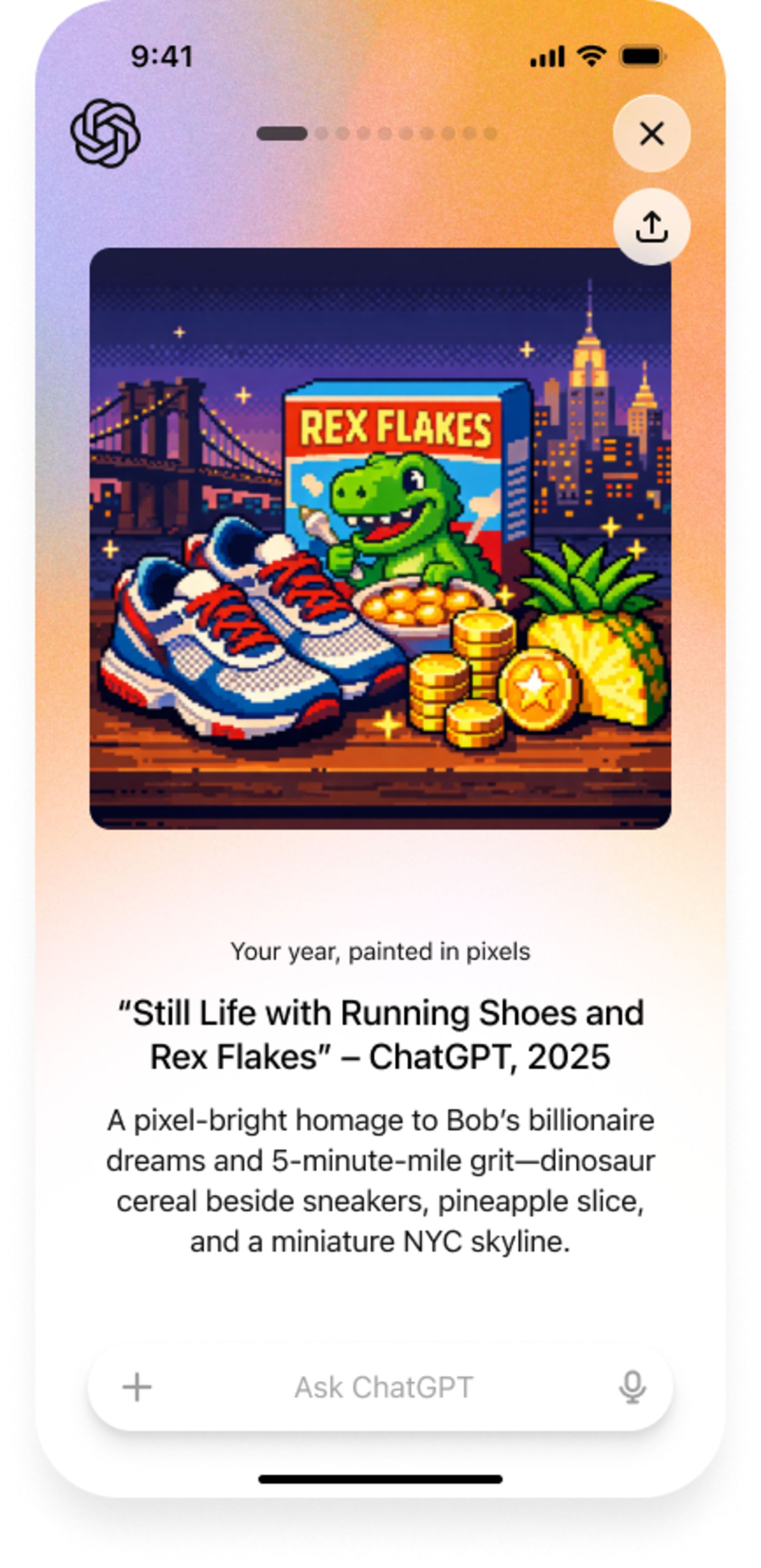 Ще одним елементом Your Year with ChatGPT є автоматично згенероване зображення у піксельному стилі. Воно поєднує візуальні символи тем, до яких користувач найчастіше звертався під час спілкування з ChatGPT упродовж року.