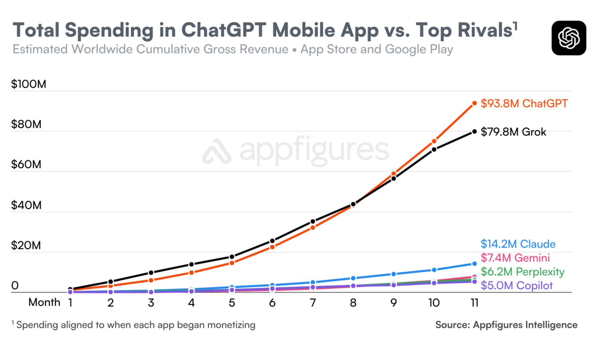 Загалом ChatGPT досяг позначки у $3 мільярди за 31 місяць. Це значно швидше, ніж у багатьох інших популярних застосунків. До прикладу TikTok знадобилося 58 місяців, щоб вийти на аналогічний рівень споживчих витрат.